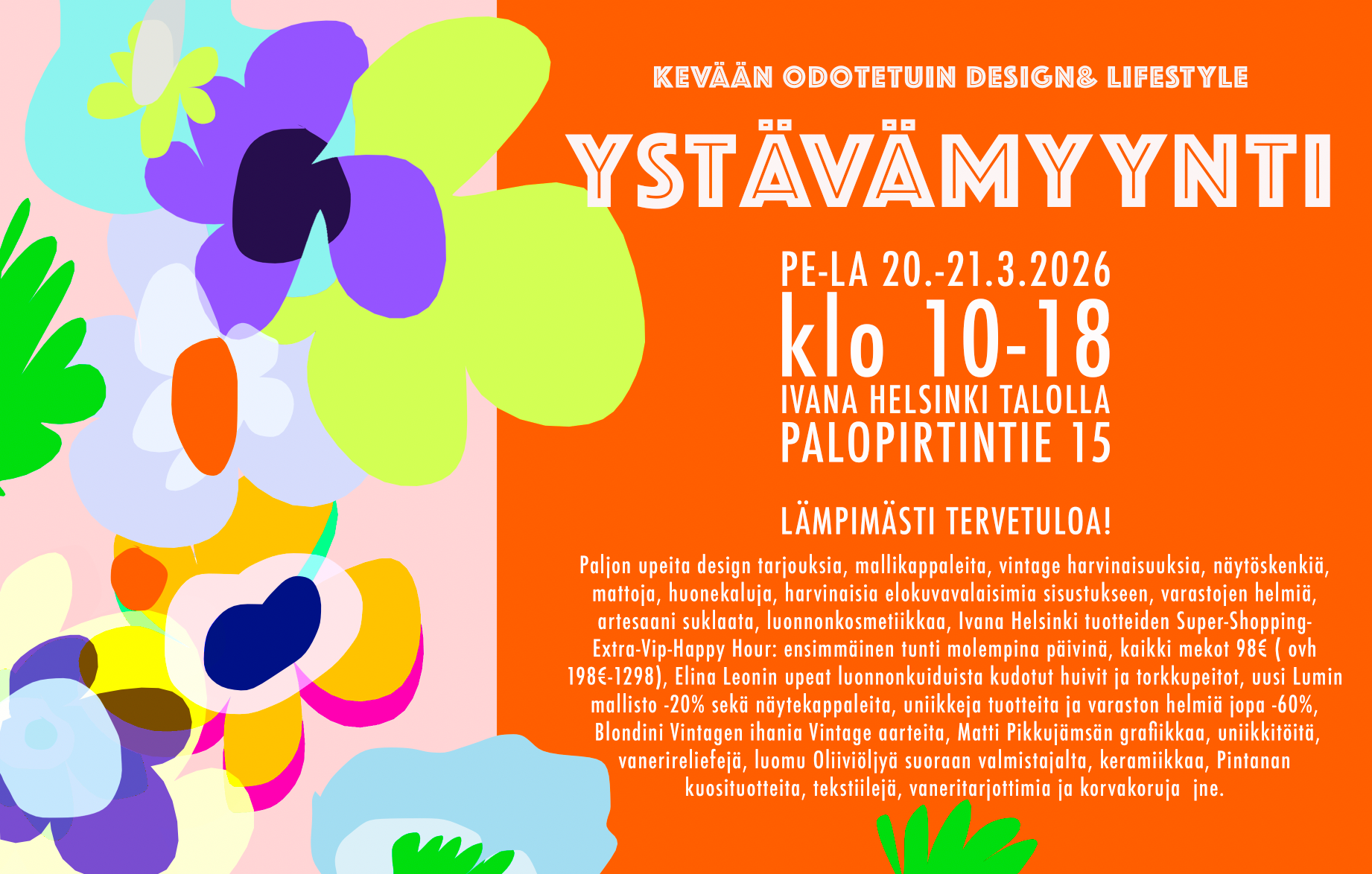 Paljon upeita design tarjouksia, mallikappaleita, vintage harvinaisuuksia, näytöskenkiä, mattoja, huonekaluja, harvinaisia elokuvavalaisimia sisustukseen, varastojen helmiä, artesaani suklaata, luonnonkosmetiikkaa, Ivana Helsinki tuotteiden Super-Shopping-Extra-Vip-Happy Hour: ensimmäinen tunti molempina päivinä, kaikki mekot 98€ ( ovh...
